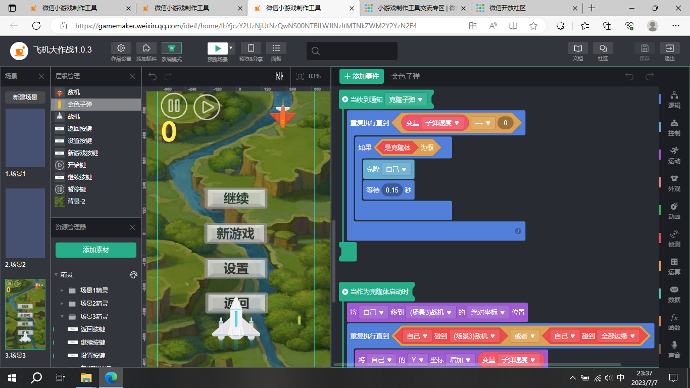当我在场景3中暂停子弹克隆体,然后继续运动是没问题的,但是切换场景后就不行了,如下: