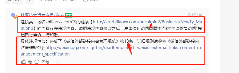 具体违规情节:违反了《微信外部链接内容管理规范》第18条,详细规则请参考《微信外部链接内容管理规范》http://weixin.qq.com/cgi-bin/readtemplate?t=weixin_external_links_content_management_specification