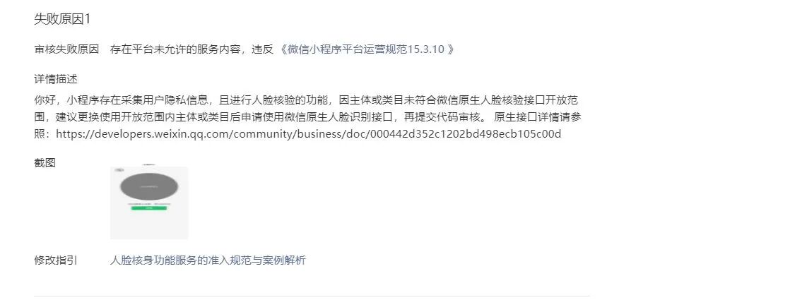 使用了wx.initFaceDetect 和wx.faceDetect 接口人脸关键点检测,上传人脸照片需要开通人脸吗(不需要使用人脸识别),版本审核不通过具体需要什么