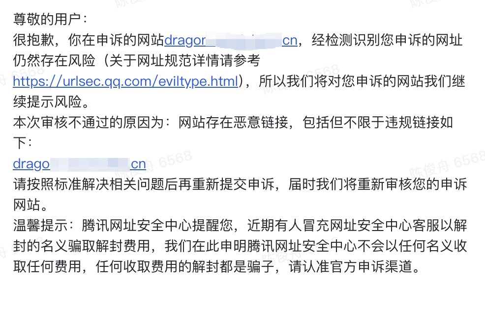 你好,经核实【dragon-work.kkkf.cn】被手机管家拦截,本系统只处理被微信暂停提供微信内直接访问的服务的外部链接的申诉问题,若非前述事宜,本系统将不予答复,故其他事宜请勿投递本系统。建议登录手机管家官网【http://gj.qq.com/online_server/complain_url.html 】自行申诉,知悉。