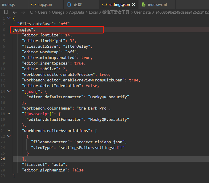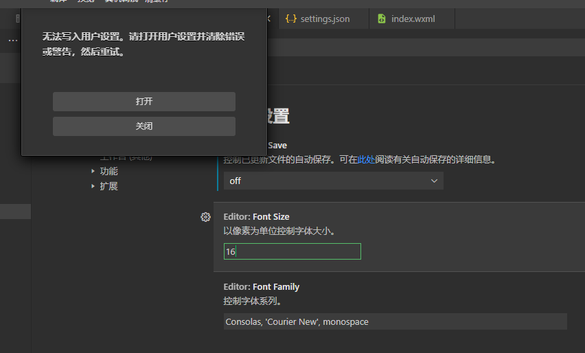 使用某些小程序片段后,编辑器设置出现问题了,无法设置。设置.json中也没法回退。