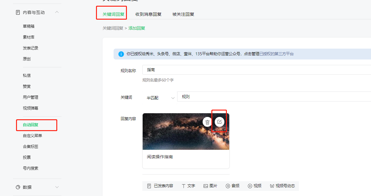 但在“自动回复”——“关键词回复”中添加这篇文章后就可以显示编辑按钮
