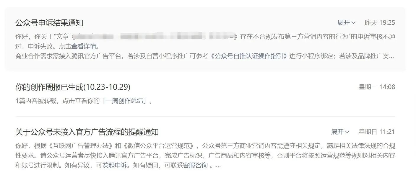 我们公众号在两周前开始,只要发布文章第二天就后台就会收到通知说存在不合规发布第三方营销内容,我们公众号是做行业报道的,好几篇都是记者去现场采访或者行业分析,中间难免会涉及到一些企业名称或者产品的信息,不知道为什么就被判断是第三方营销了。之前申诉还都通过了,昨天又申诉了一篇,把文章中关于现场记录、公司负面的部分都截图上传了,结果这次审核没有通过,请问谁家营销会写负面呢?微信官方能不能有一个明确的定义,到底哪些是第三方营销。