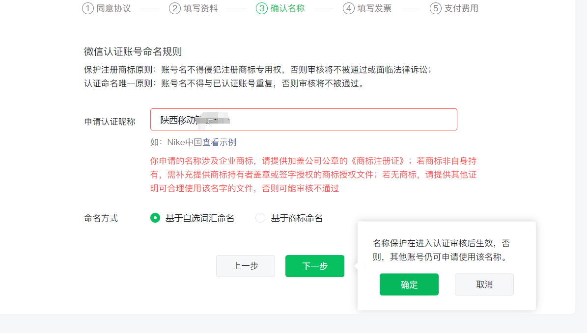 如果这个公众号认证昵称是你的主体全称或者简称,可以选择【基于商标命名】并上传营业执照辅助认证。