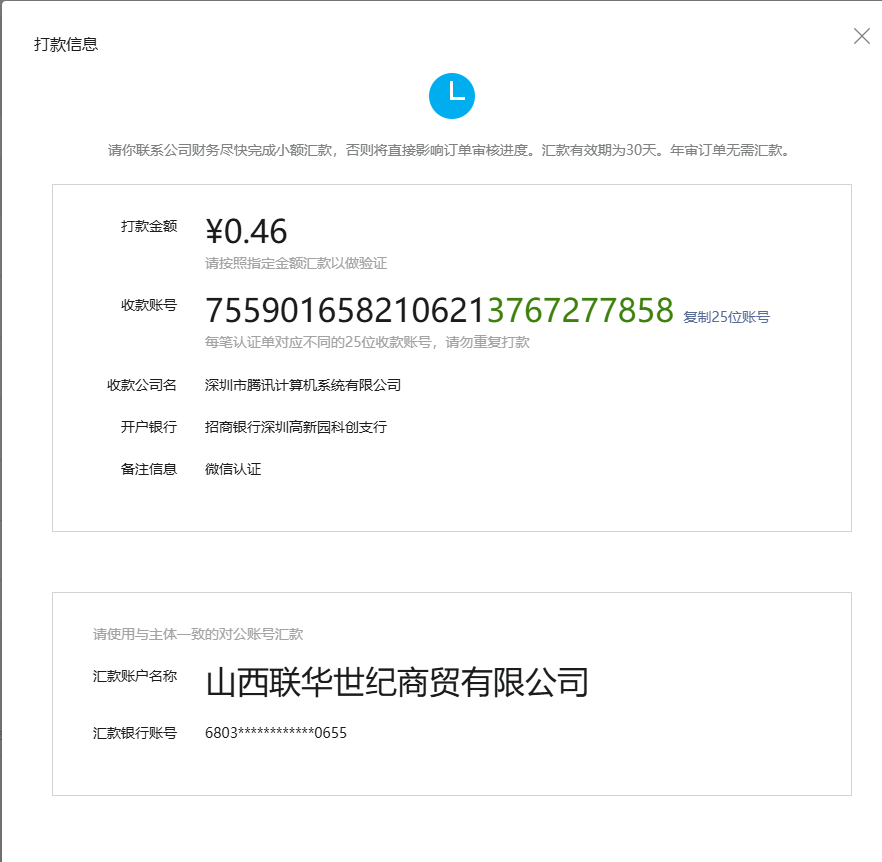 微信服务号认证一直审核中,已经小额打款