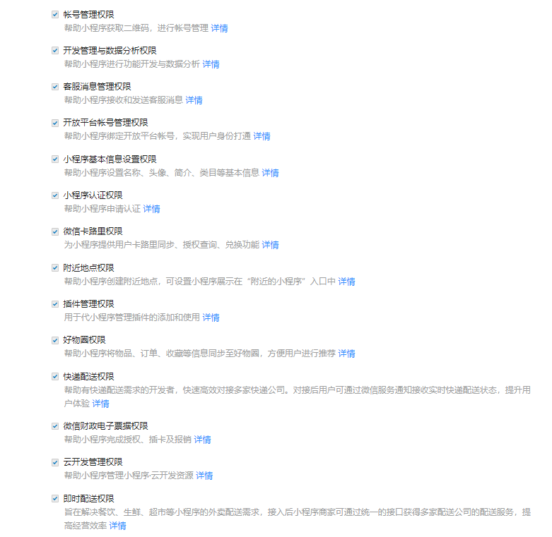 补充;权限集钩上了仅表示第三方账号配置上了,需要授权小程序扫码授权后,第三方平台才拥有对应的权限。