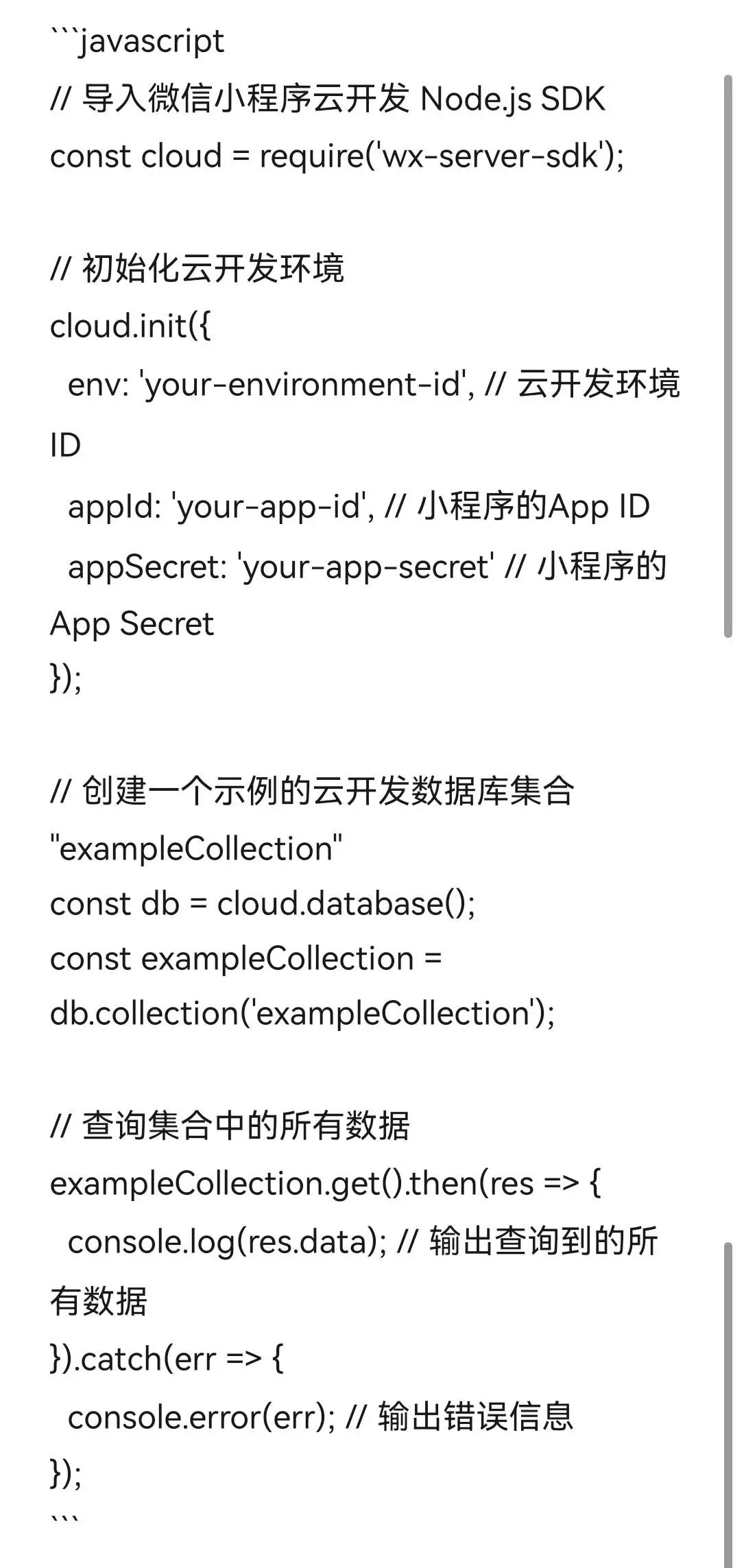 因业务需要有本地的服务器,建立一个node服务器访问微信小程序云开发的资源,却报错了。 以下是node服务器上写的简单代码 演示如何在 Node.js 服务器中使用微信小程序云开发的 Node.js SDK,通过 App ID 和 App Secret 鉴权访问云开发环境: