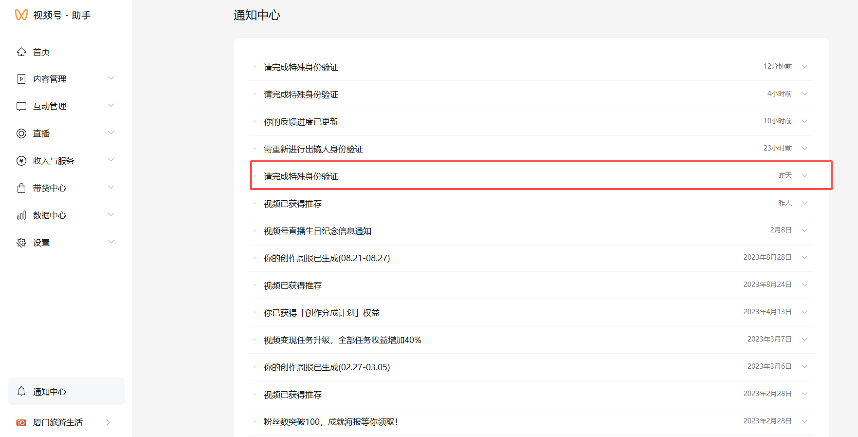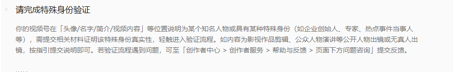 你的视频号在「头像/名字/简介/视频内容」等位置说明为某个知名人物或具有某种特殊身份(如企业创始人、专家、热点事件当事人等),需提交相关材料证明该特殊身份真实性,轻触进入验证流程。如内容为影视作品剪辑,公众人物演讲等公开人物出镜或无真人出镜,按指引提交说明即可。若验证流程遇到问题,可至「创作者中心>创作者服务 >帮助与反馈 > 页面下方问题咨询」提交反馈。