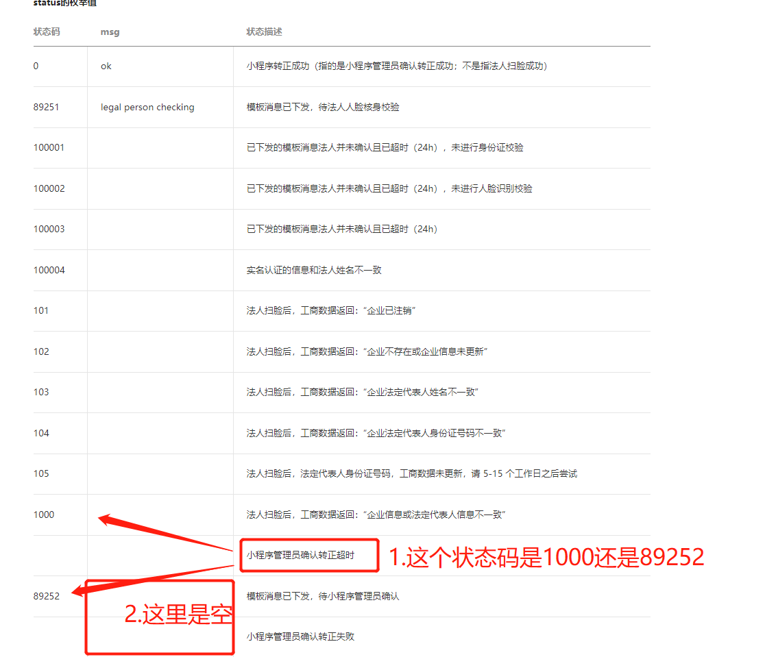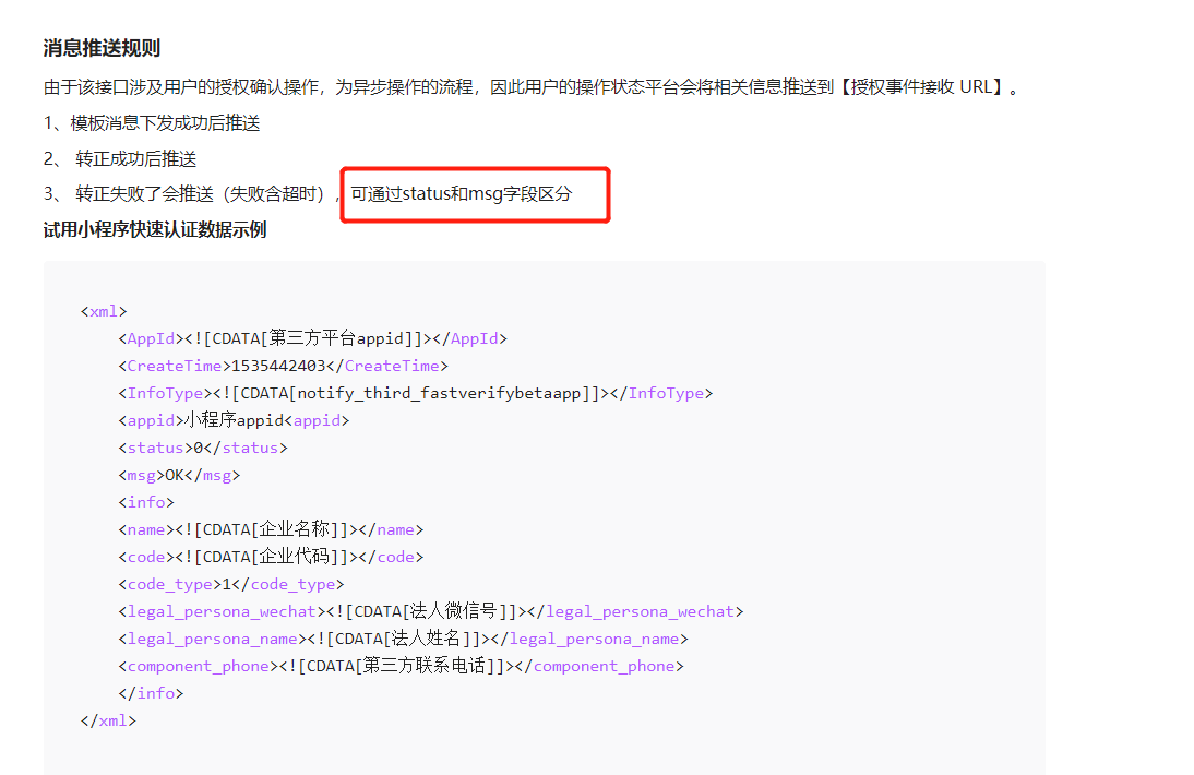 微信第三方平台下 ,试用版小程序转正的接口文档中,关于推送消息都用同一个消息体,但是status和msg并不是很明确,尤其是msg为空