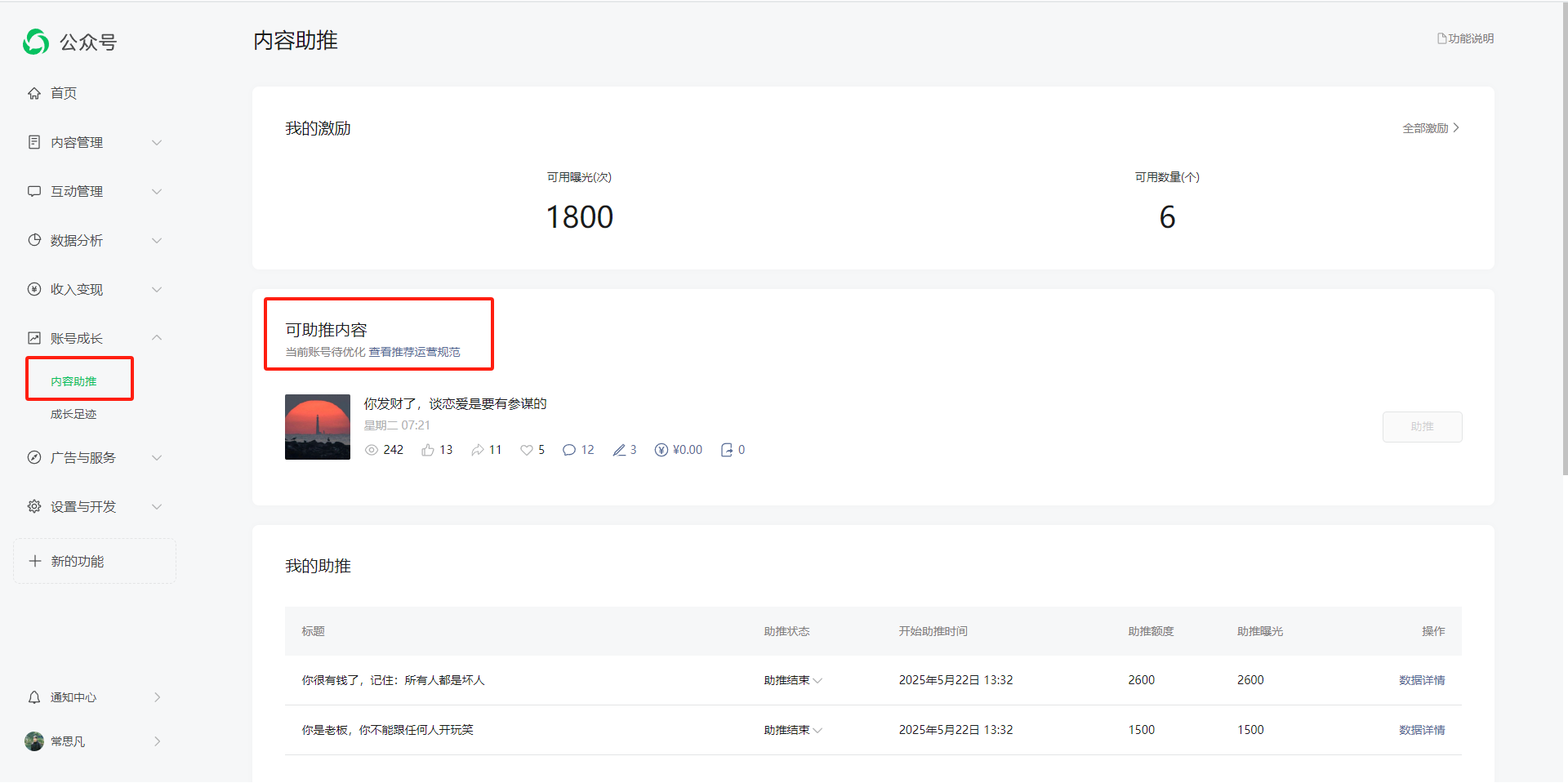 这是我的内容助推页面,我看到其他账号显示待优化之后,这里会给出待优化的文章,公众号主根据对应文章进行删减就可以恢复。