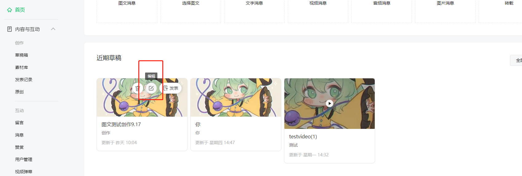 你好,在草稿箱中编辑过的图文是会出现在首页—近期草稿中,也是可以直接点击进行修改的。