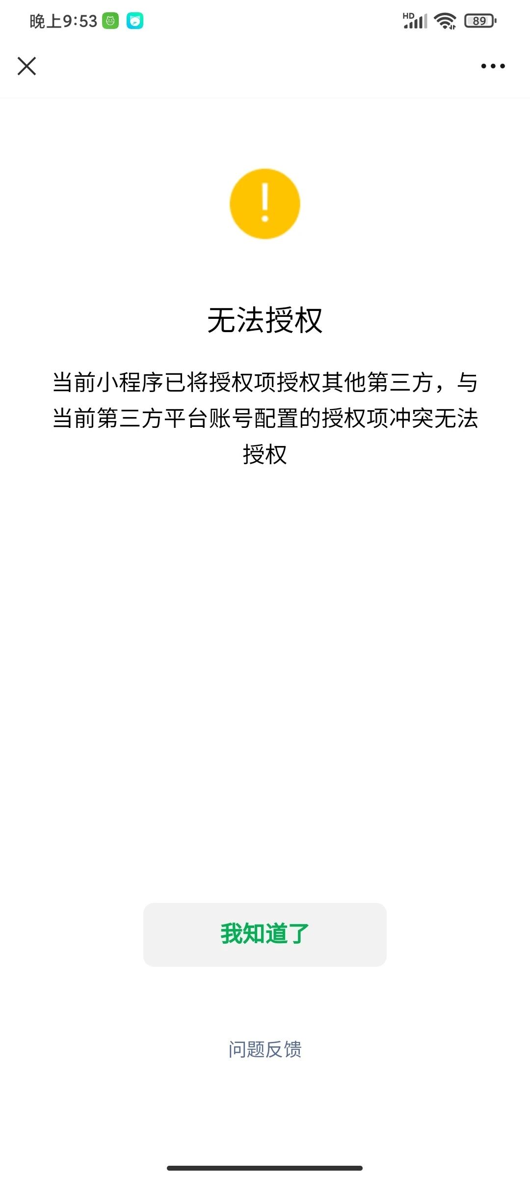 你好,小程序已将权限集授权给了其他第三方平台,如需授权给当前第三方平台,需要先取消授权给其他第三方平台的权限集,才能重新扫码授权给当前第三方平台。