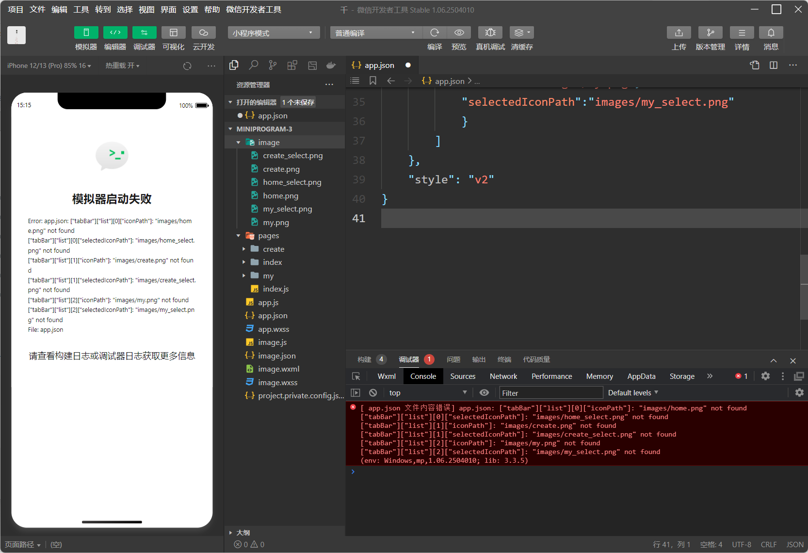 真机调试后出现如下问题,大致是找不到对应文件,帮忙看看。[app.json 文件内容错误]app.json: ["tabBar"]["list"][0]["iconPath"]:"images/home.png”not found