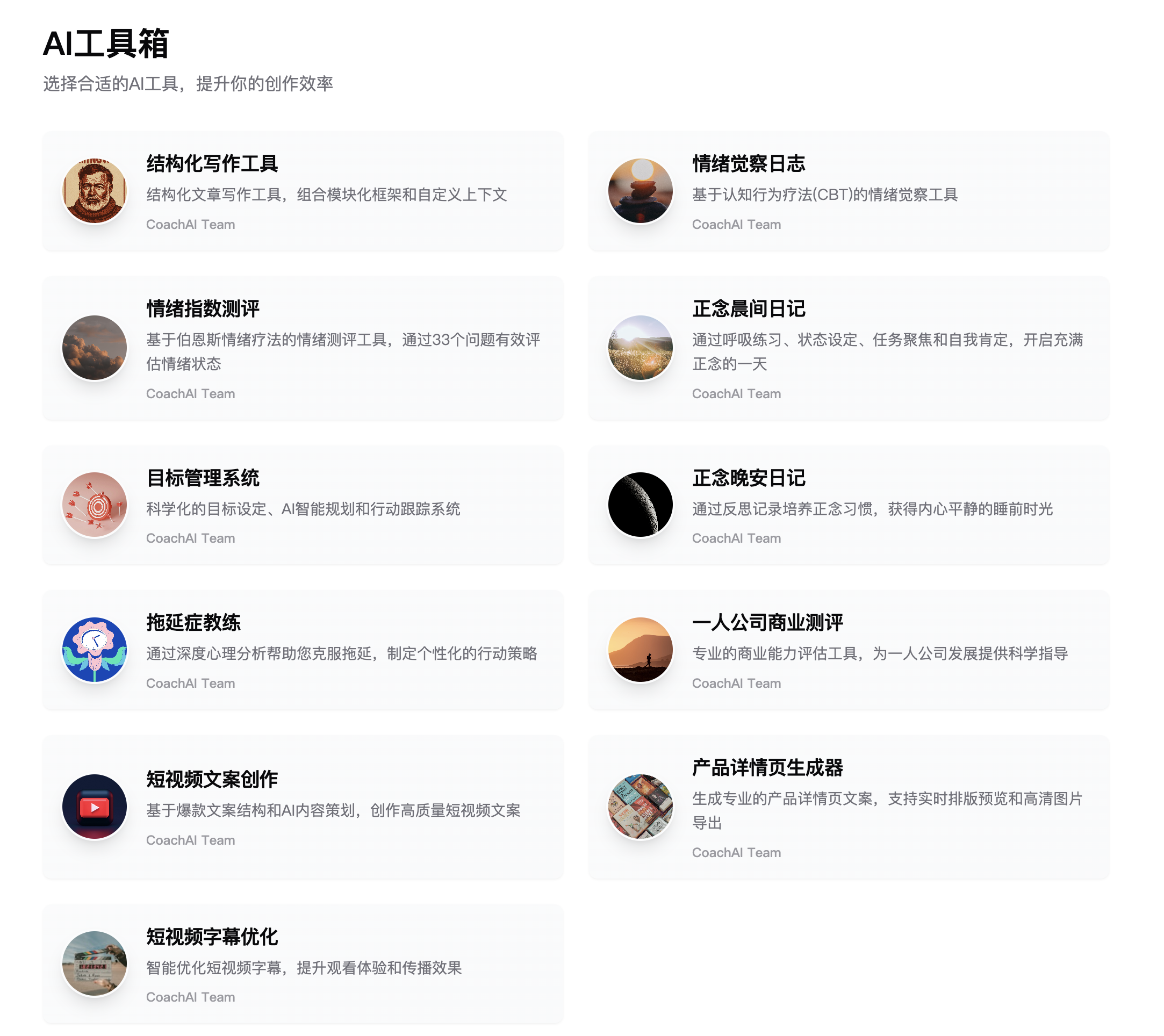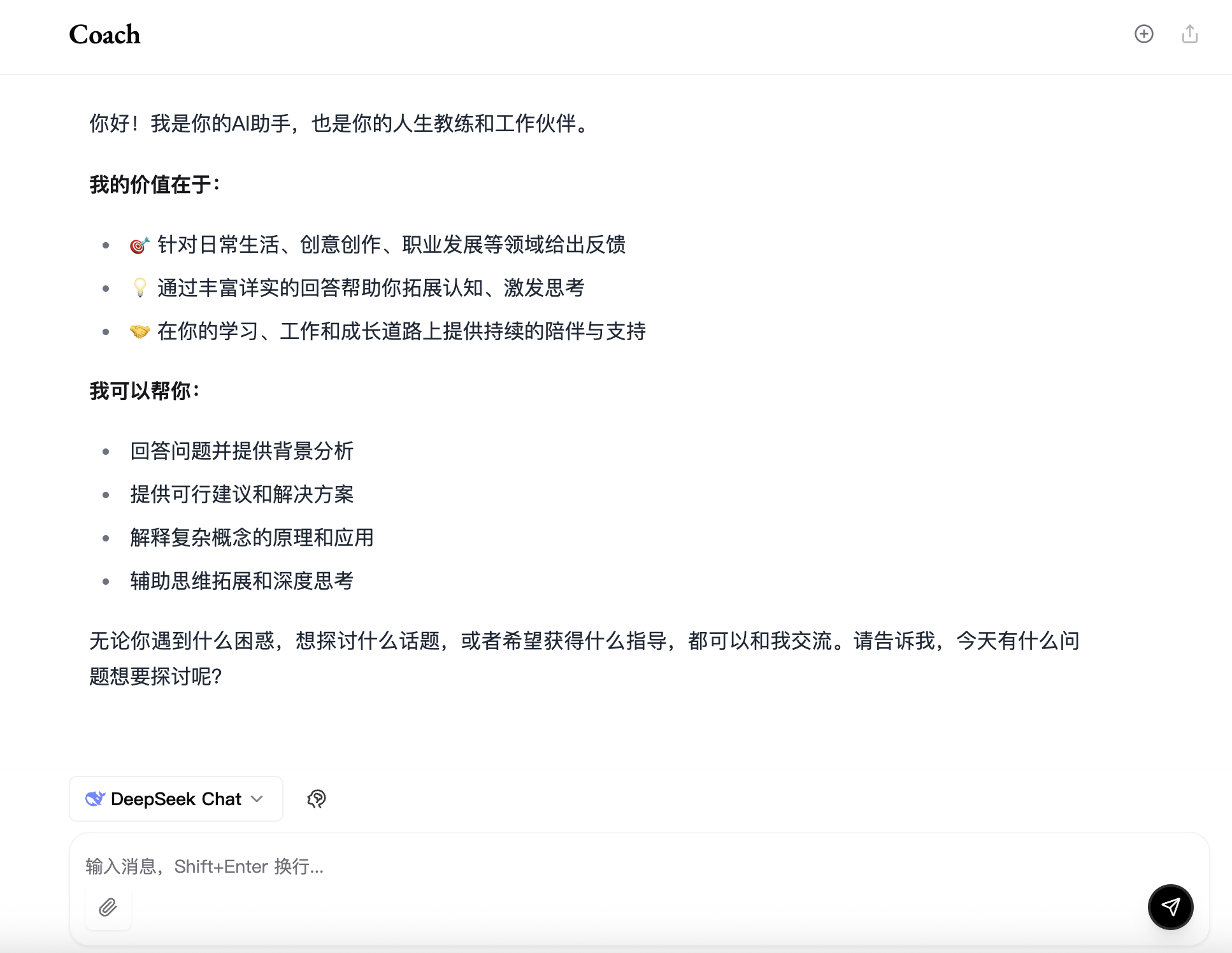 尊敬的审核团队:我是网页开发者,coach.im网站是我基于DeepSeek、kimi等大模型开发的AI教练工具,致力于通过AI帮助职场人和创作者提升工作效率。
