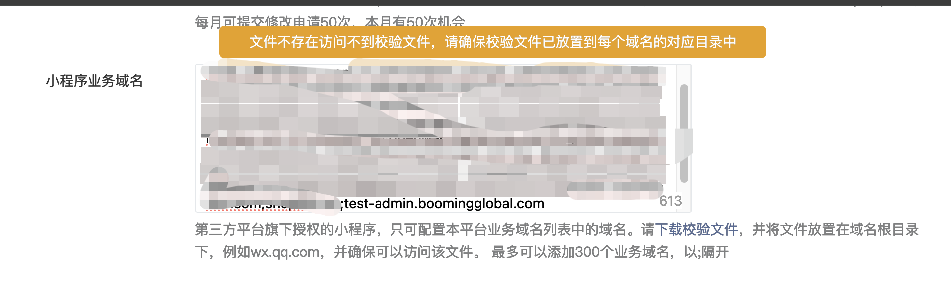 已经通过浏览器测试输入框内所有的域名,校验文件均可以正常访问。添加新域名时,就一直提示这个错误。