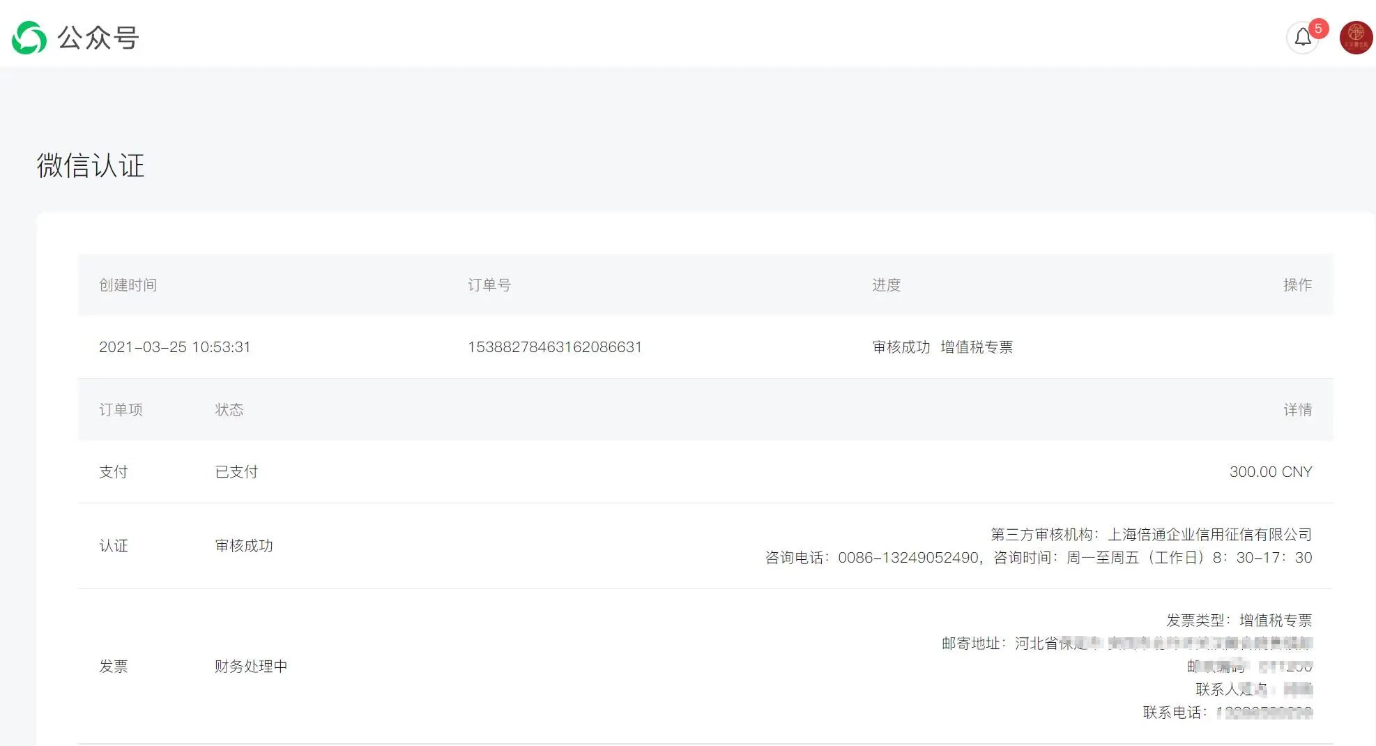 微信认证已经3个月,还没有开具发票,还在财务处理中