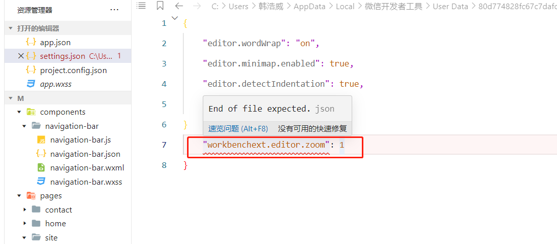 修改主题颜色显示无法写入用户设置,请打开用户设置消除警告。并且显示这个地方有红色下划线!,这个怎么解决啊大佬们1