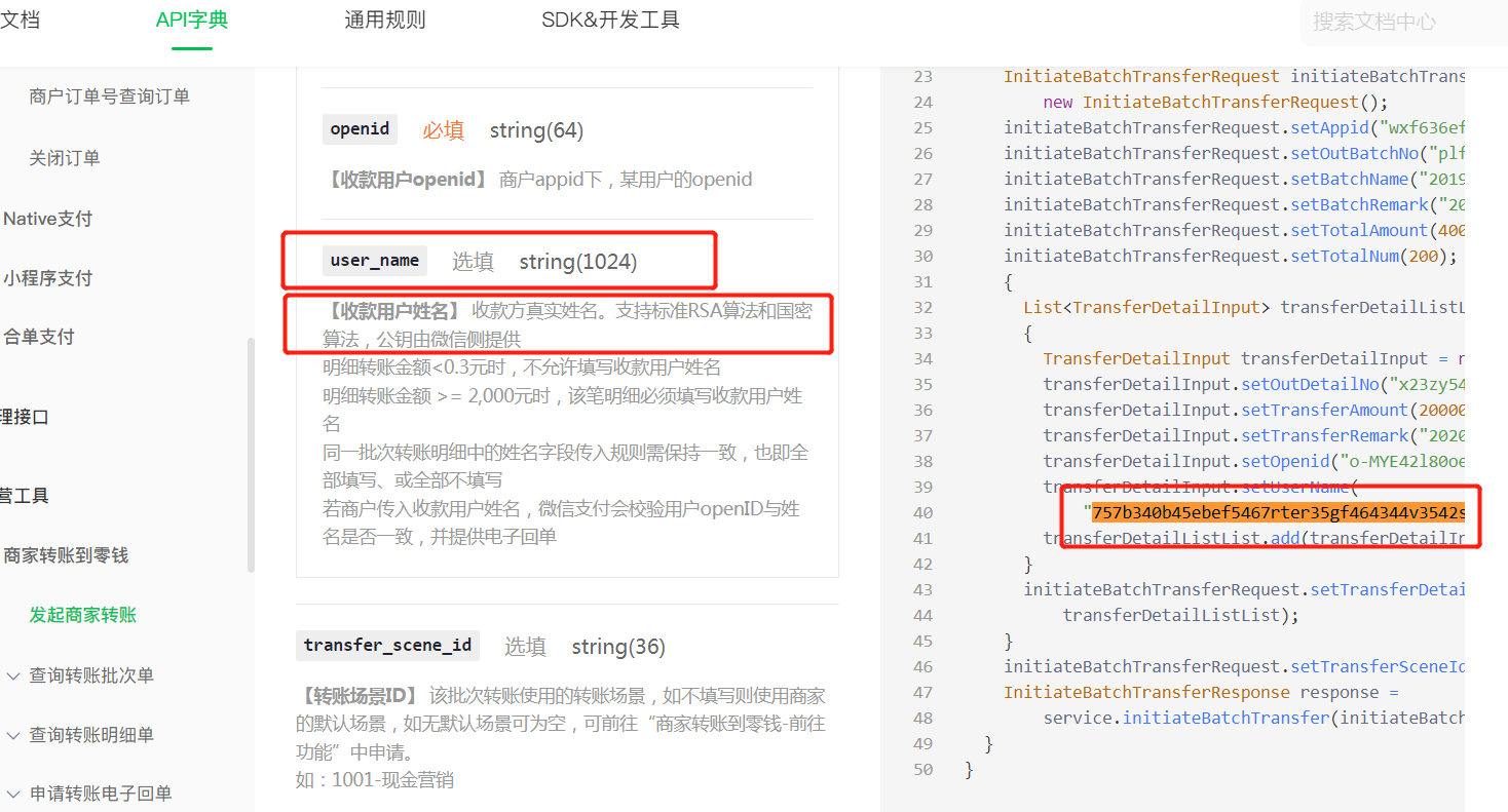 发起商家转账大于2000,user_name为必填,示例中只是说要加密,需要怎么操作? Demo的user_name 只是突然出现了一串加密字符,是调用哪个依赖方法?
