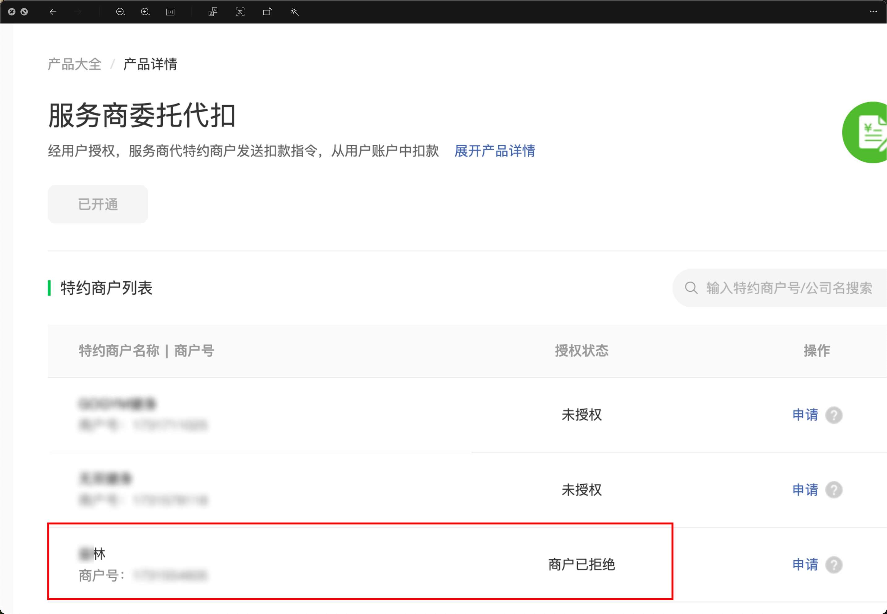 你好,我们是微信支付的服务商,目前相帮特约商户开通委托代扣,完成微信月付的功能,申请之后,总是提示授权状态商户已拒绝,这个是代表什么意思,商户这边联系后表示从未拒绝过这个授权,想通过社区平台里了解下情况,我是需要再次申请吗?还是说是通过什么样子的形式需要商户同意?