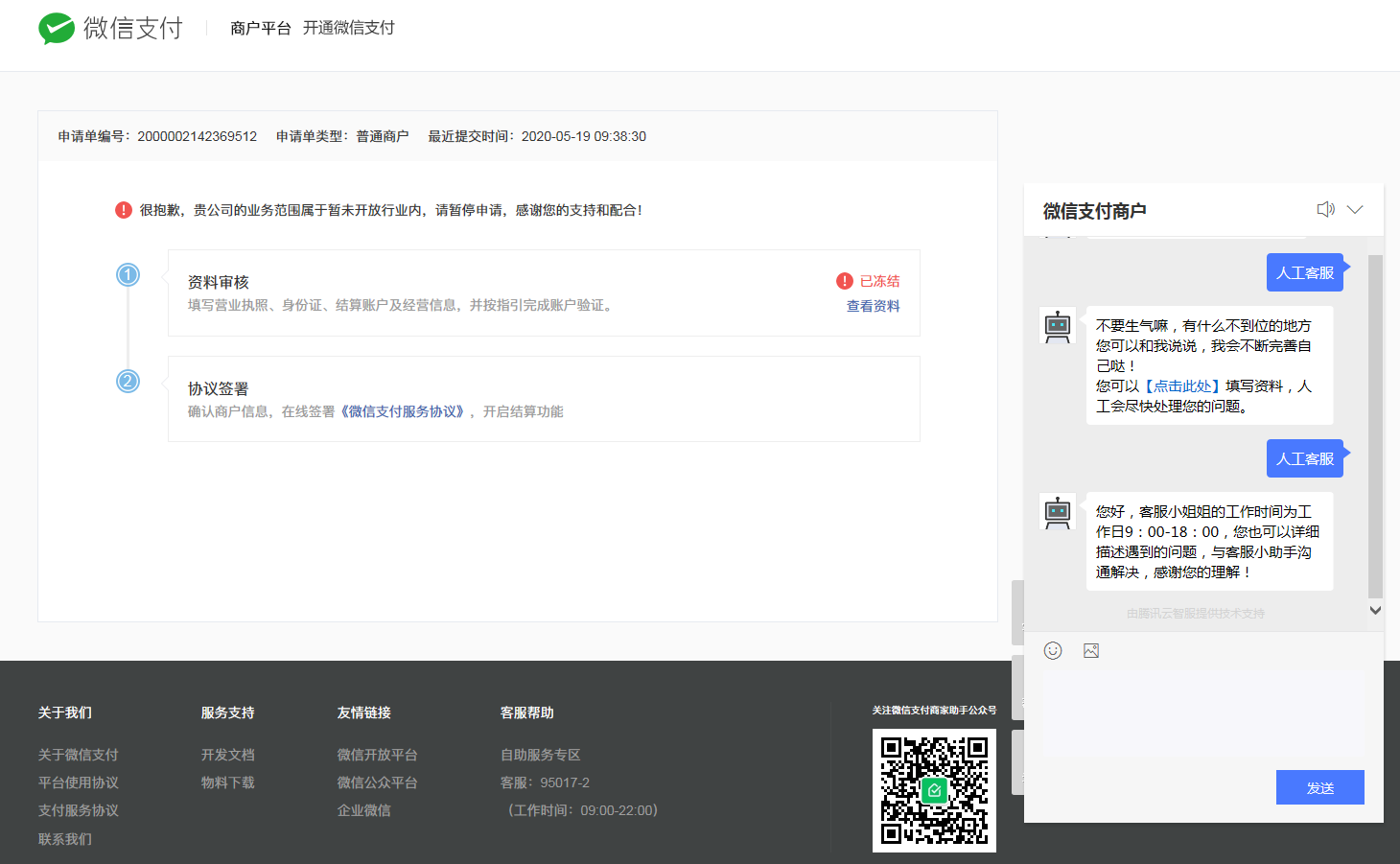 申请商户号 审核结果已冻结 提示“很抱歉,贵公司的业务范围属于暂未开放行业内,请暂停申请,感谢您的支持和配合!” 请问如何判断哪些业务属于为开放行业 如何解除冻结继续申请 申请订单编号: 2000002128895573