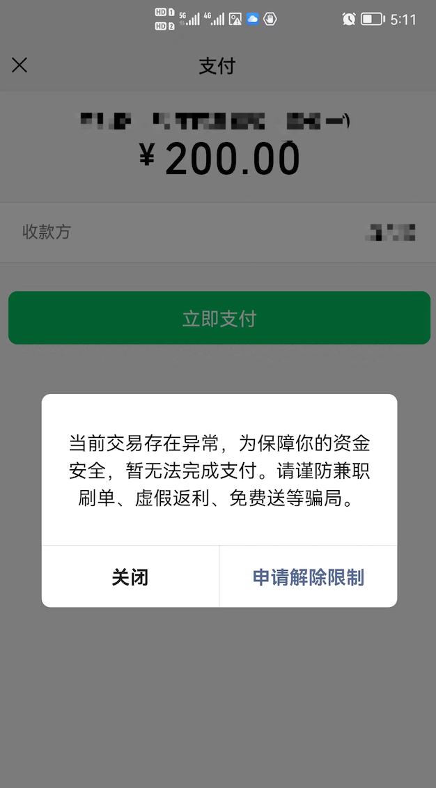 当前交易异常,为保障你的资金安全,暂无法完成支付。请谨防兼职刷单、虚假返利、二手交易、免费送等骗局。