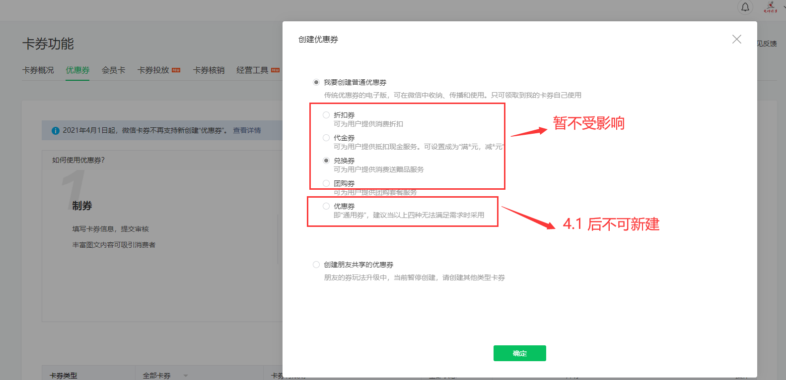 4.1 后微信卡券无法新建“优惠券”,其他的“折扣券”,“代金券”,“兑换券” 受影响吗?