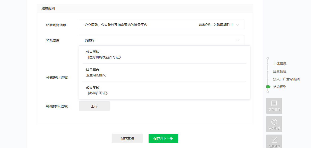由于业务需求,我们需要申请微信支付实名信息小程序授权接口能力,由于之前小程序业务不涉及到支付,申请微信支付的时候需要选择结算规则信息和特殊资质,请问应该怎么选择