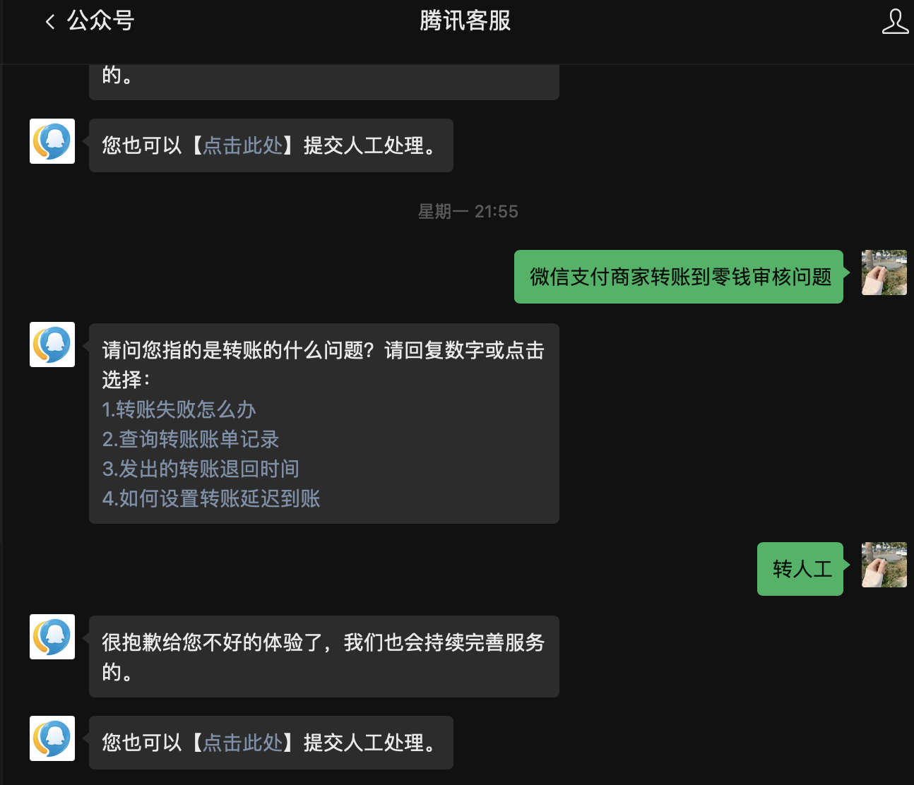 一般审核最长一周,如果还审核不通过,可以在微信中搜索【微信支付商家助手】公众号,发送【人工客服】咨询,可能需要多发送几遍【人工客服】