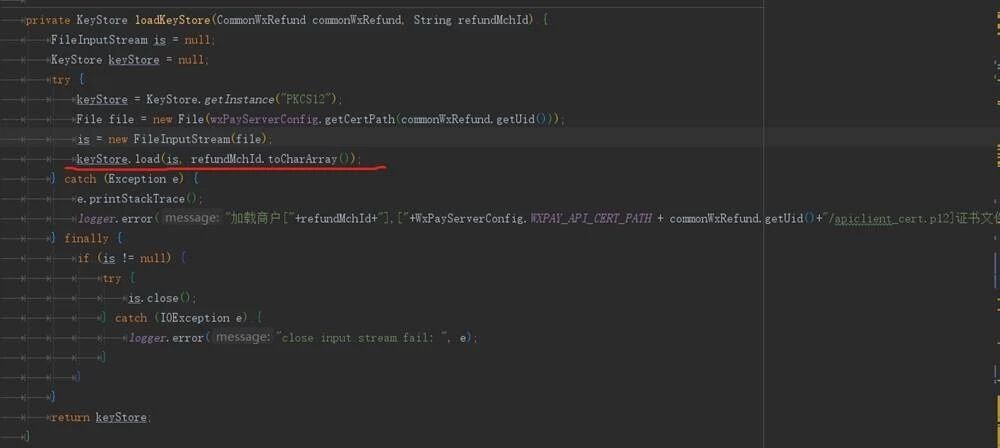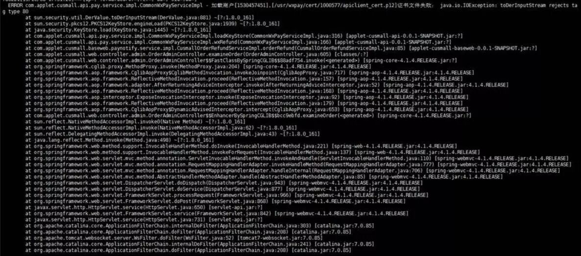 在执行keyStore.load(is,refundMchId.toCharArray()) 方法读取api证书时,会返回错误信息:java.io.IOException: toDerInputStream rejects tag type 80。这个问题是说明提供的api证书有问题么?
