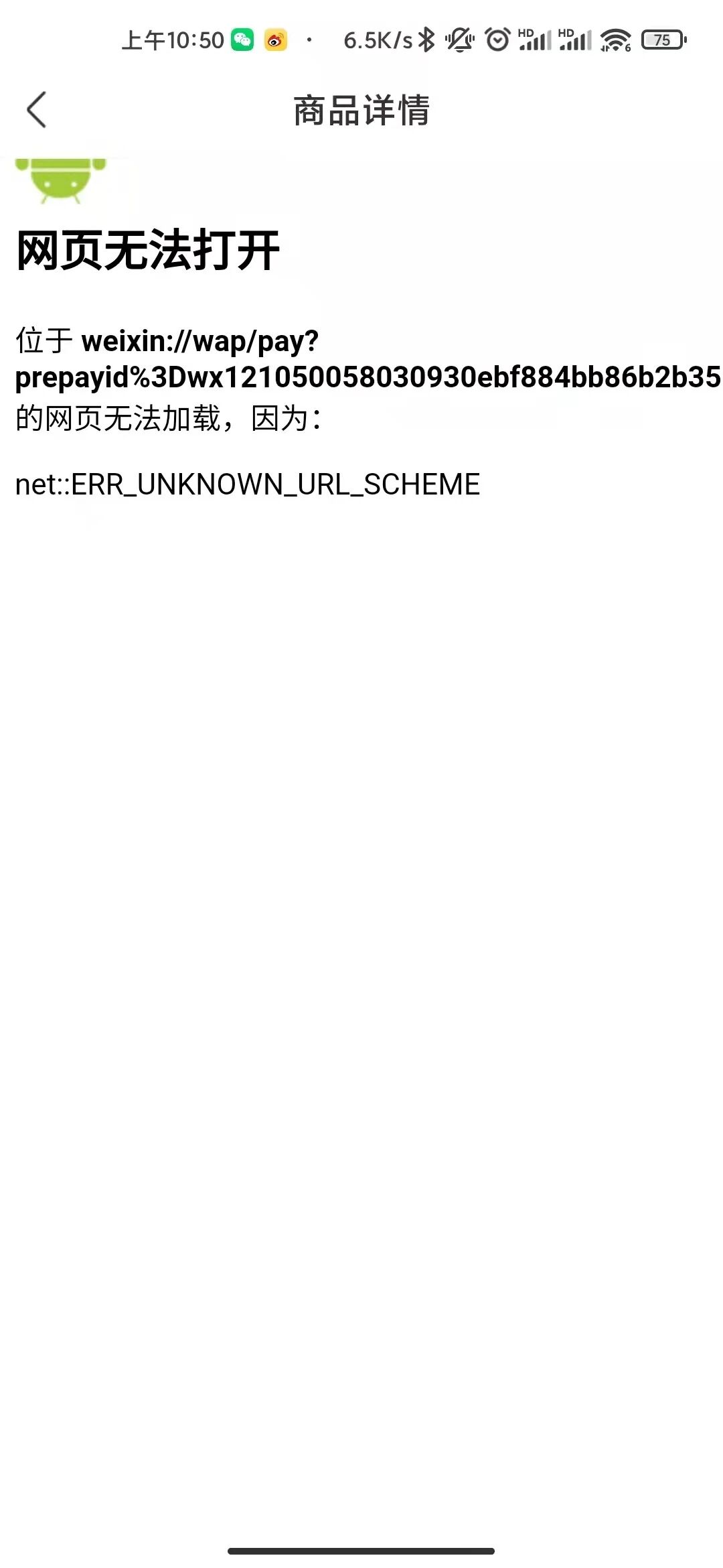 如图所展示,调起支付时,参数后缀也给了redirect_url参数,在普通H5浏览器,可返回到redirect_url的页面上,app中却显示图上网页无法打开