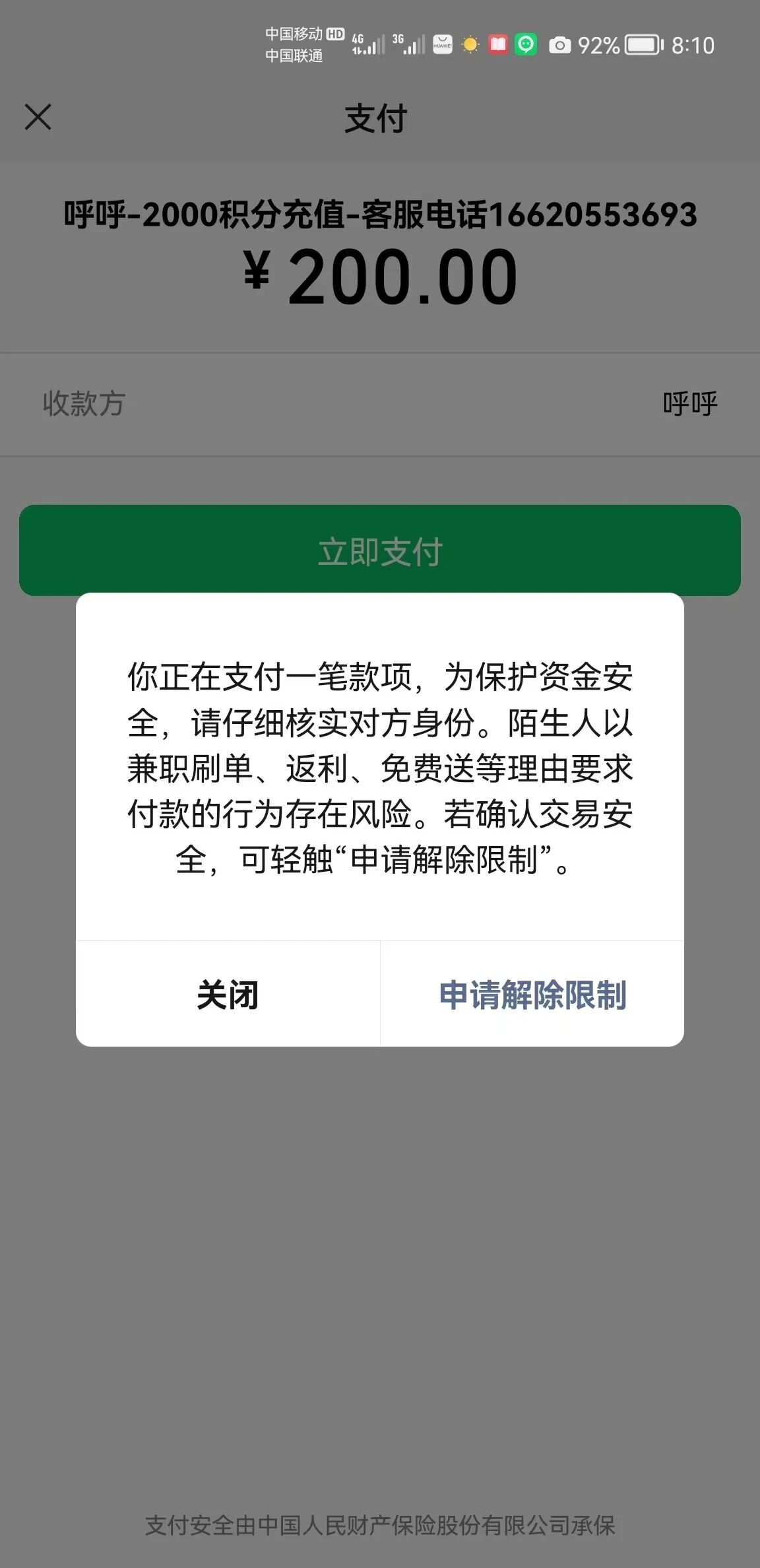 你正在支付一笔款项,为保护资金安全,请仔细核对对方身份,陌生人以jianzhishuadan、返利、免费送等理由要求付款行为存在风险。如确认交易安全,可轻触“申请解除限制”。