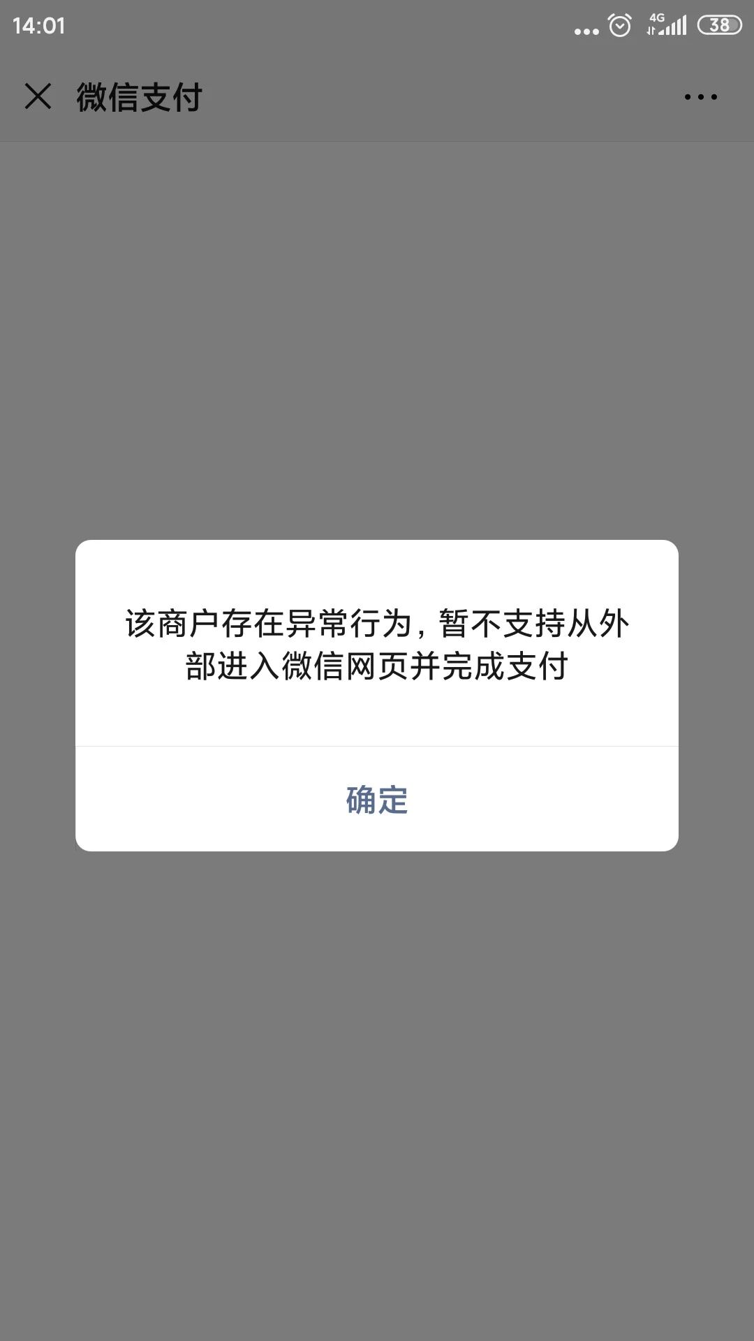 就提示: 该商户存在异常行为,暂不支持从外部进入微信网页并完成支付。