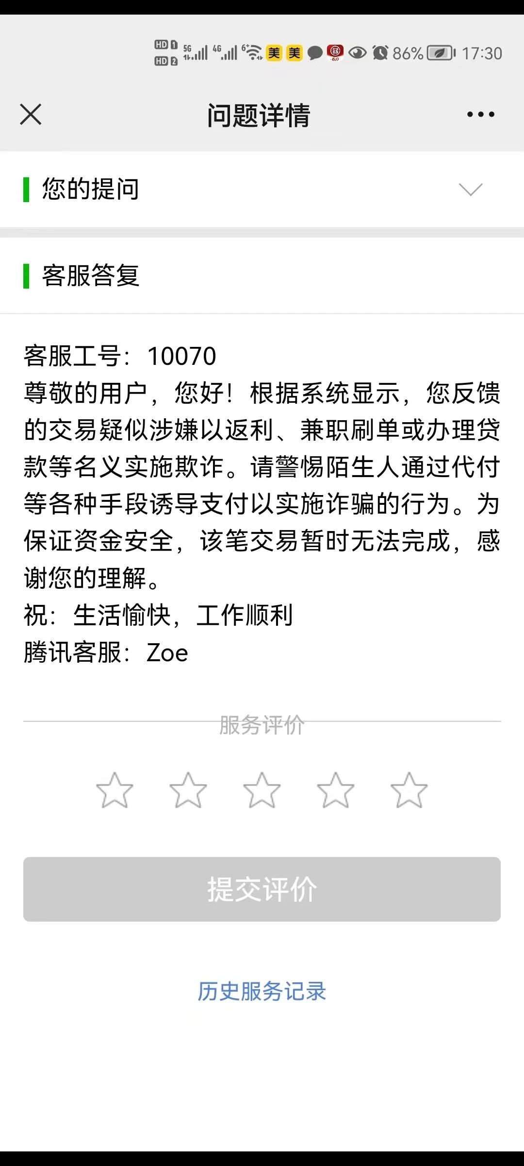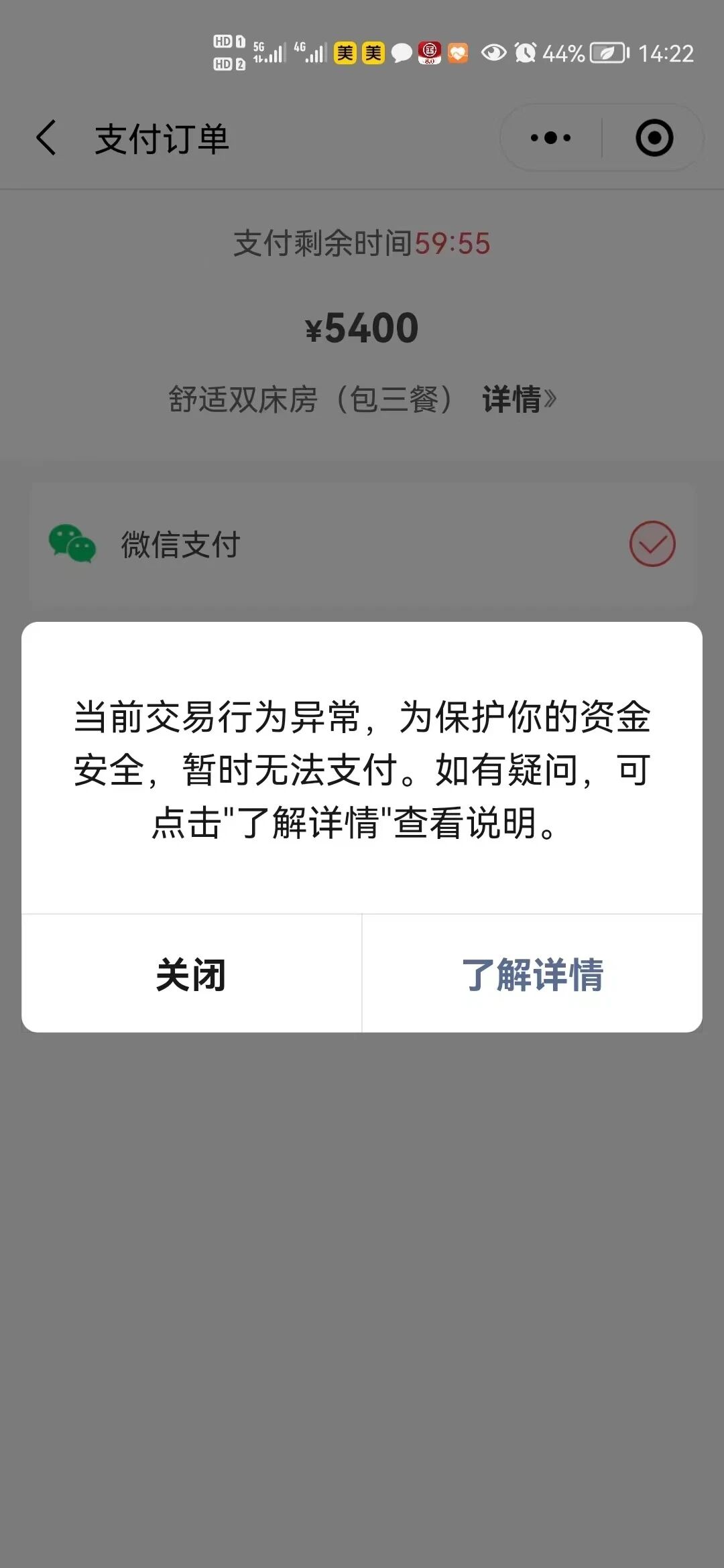 用户在小程序支付时提示“当前交易行为异常,为保护你的资金安全,暂时无法支付,如有疑问,可点击“了解详情”查看说明”,用户按照下面的截图步骤提交审核后,回复了截图的内容