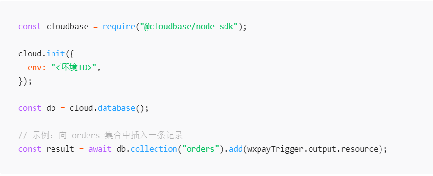 const result = await db.collection("orders").add(wxpayTrigger.output.resource);const cloudbase = require("@cloudbase/node-sdk");