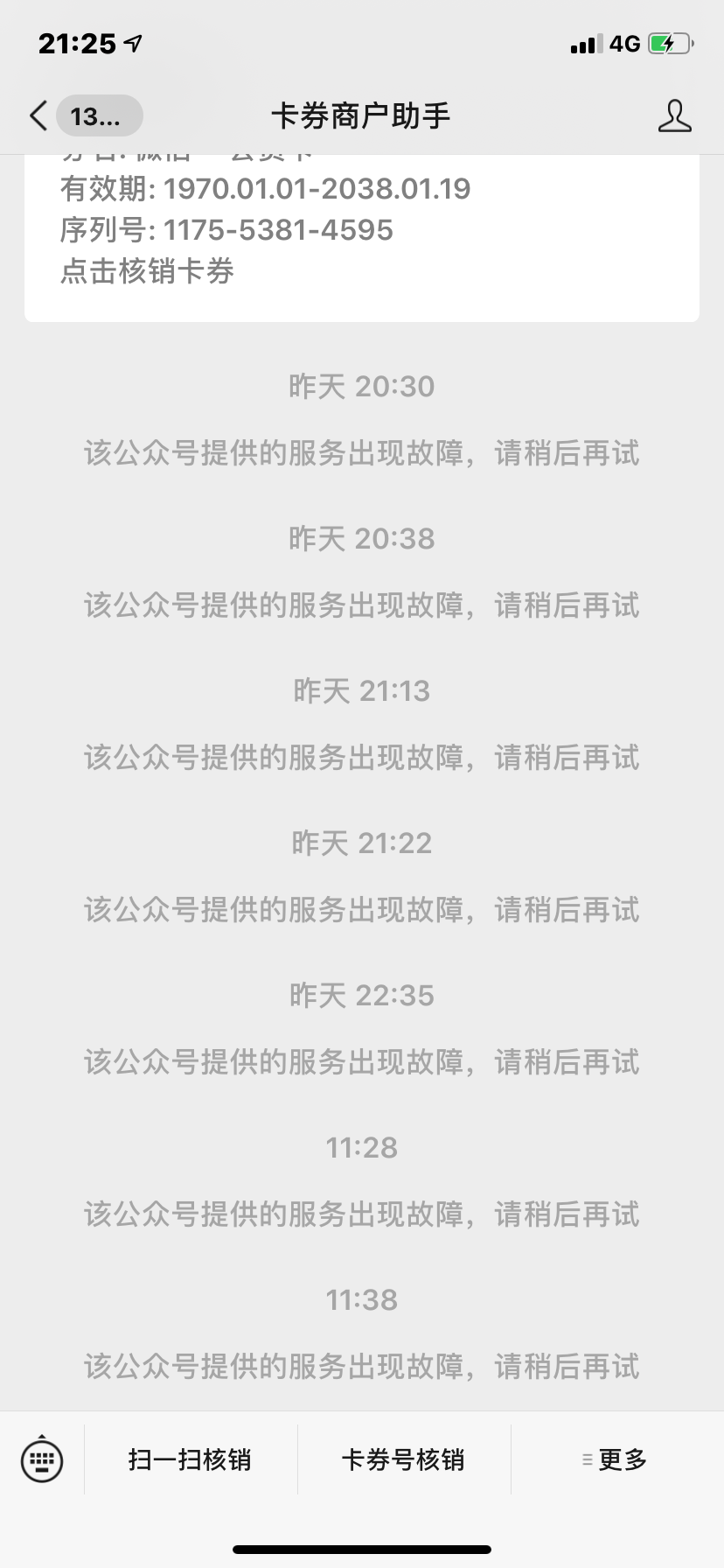我这边也是这种问题,扫一扫的话没有反应,再者出现“该公众号提供的服务出现故障,请稍后再试”,但是卡券号核销却能使用?