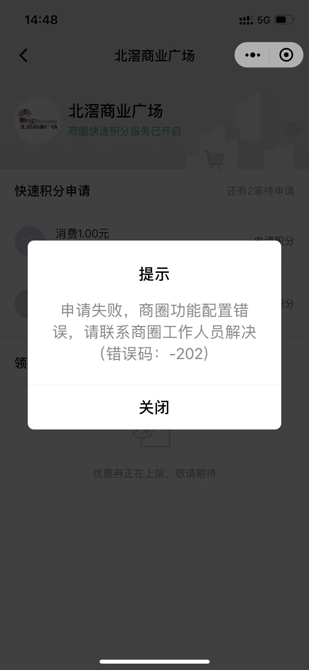 272948743:商圈开启【用户补录围栏限制】,用户手动申请时,会校验用户是否在商圈内,如不在商圈内,则无法成功积分。该问题可通过商圈自行解决:确定用户补录积分地理位置,用户返回场内进行积分申请,即可正常积分。