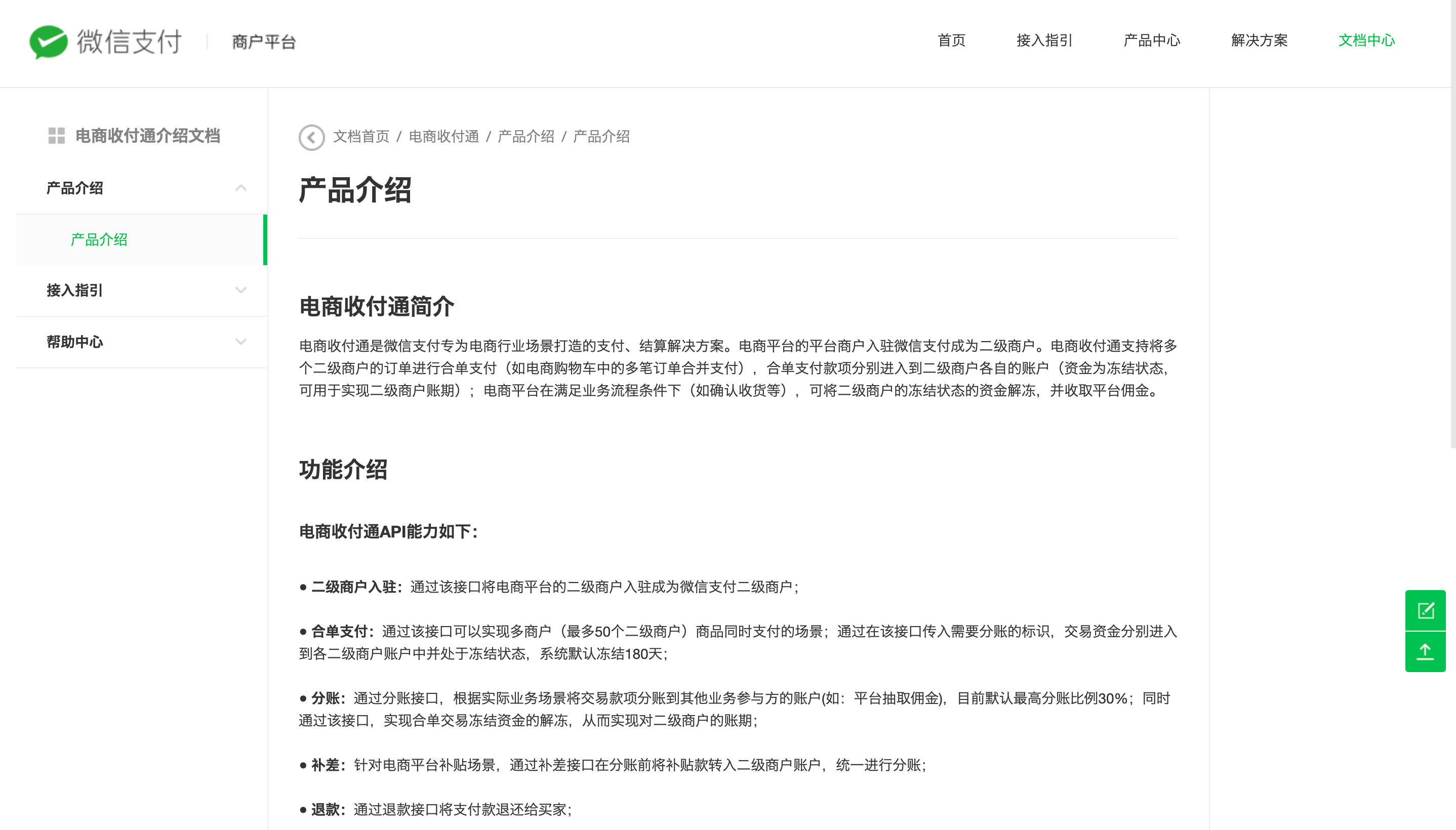 看到文档中有“电商收付通”产品,但是一直没有找到开通的入口,想知道这个功能是不是开放了,入口在哪儿?