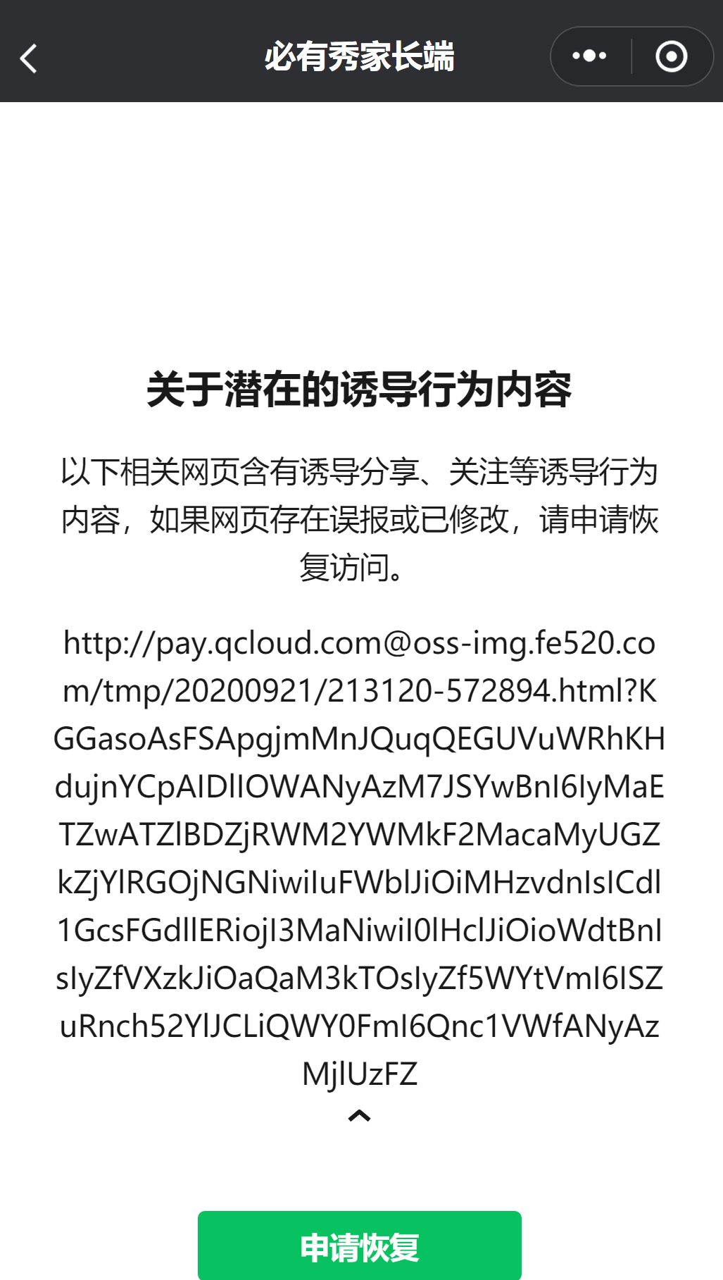 申请恢复了,但是不通过,也没有给具体哪里不合规或违规的消息,我们也不知道具体哪个页面或者二级域名下的哪个页面不合规,就说不合格,我也是醉了,无语,,,脑残的申诉服务!!!微信无缘无故封掉整个域名,导致服务受限,已考虑不在微信内部做,无奈放弃,严重违背微信客户的拓展业务,忘了初心,悲哀!!!