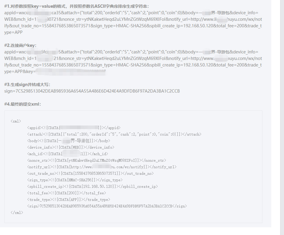 {nonce_str=UXKEsc465uKs1mLKQIZLF2uxN0wogXIV, sign=650414BDC8292914D9EF9346C5874F18C9518CDD25773386C02C3F961C9490C1, body=****-导游包, notify_url=http://www.liuhuohuyu.com/wx/notify, mch_id=*****, spbill_create_ip=192.168.50.120, device_info=WEB, out_trade_no=15584370459486901229, total_fee=200, appid=******, trade_type=APP, attach={"total":200,"orderId":"5","cash":2,"point":0,"coin":0}, sign_type=HMAC-SHA256}