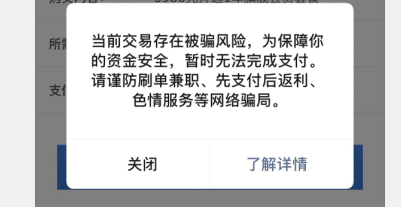 另外有人说这是用户自己支付账号问题,如果是用户自己问题,弹窗不应该是写:“你的交易账号存在风险” 而不是写当前交易存在被骗风险。 、