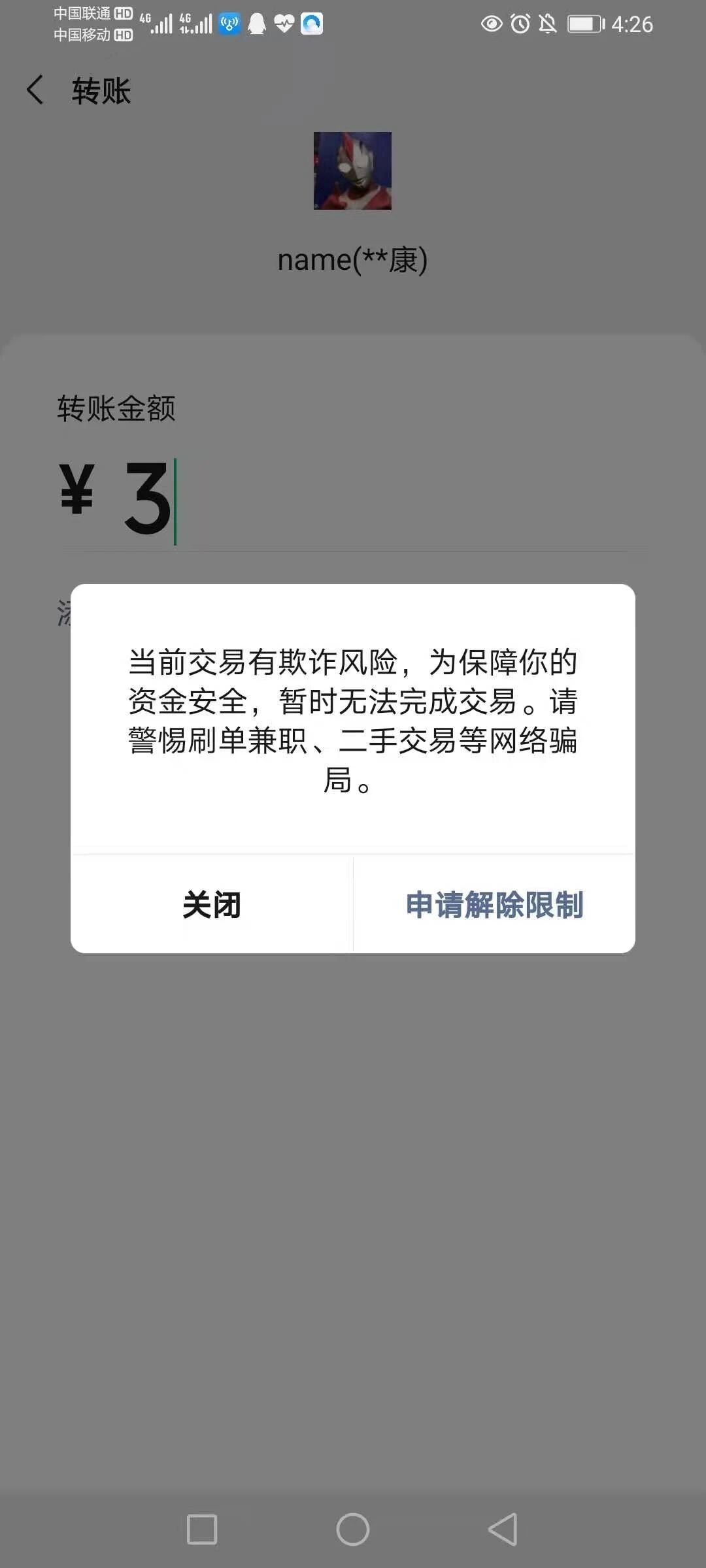 朋友给我转账显示“ 当前交易有欺诈风险,为保障你的资金安全,暂时无法完成交易。请警惕刷单兼职、二手交易等网络骗局。 ”