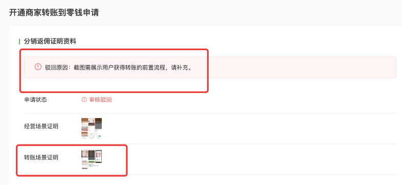 申请被驳回,但截图中已经充分说明了用户分账玩法,分销转账的全链路流程,驳回说还要补充材料