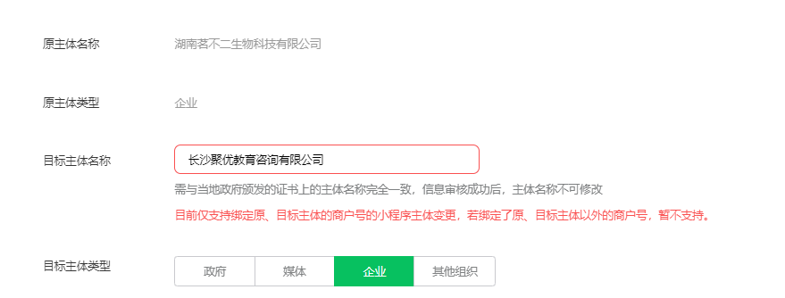 小程序主体更换,要求不能有其他商户号,小程序有除原主体和目标主体之外得商户号