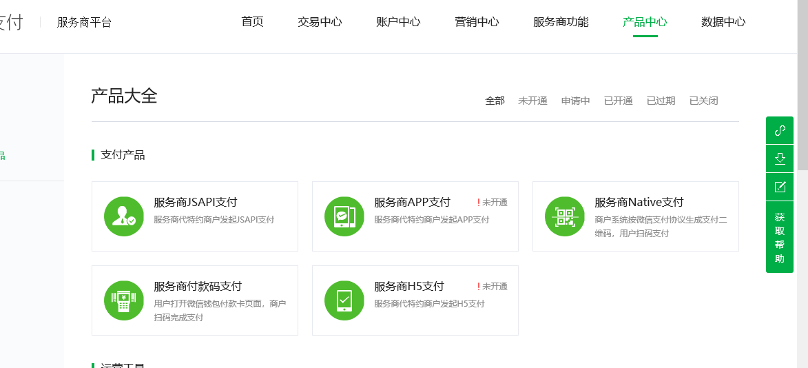 目前在微信支付开放平台上,看到微信已经能支付普通服务商开发小程序支付了,并且相应的接口文档,操作指引已经出来了。但是我在我的服务商后台,搜索产品中心,完全找不到可以申请开通小程序支付的地方,望能指导普通服务商应该在哪里申请开通小程序支付的权限,谢谢!
